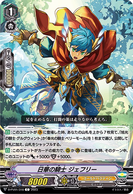 【自】:このユニットが(V)に登場した時、あなたの山札を上から7枚見て、「旭光の騎士 グルグウィント」か「春光の騎士 ベリーモール」を1枚まで選び、公開して手札に加え、山札をシャッフルする。【自】:このユニットがカードの能力で、(R)か(G)に登場した時、そのターン中、このユニットのパワー+5000/シールド+5000。