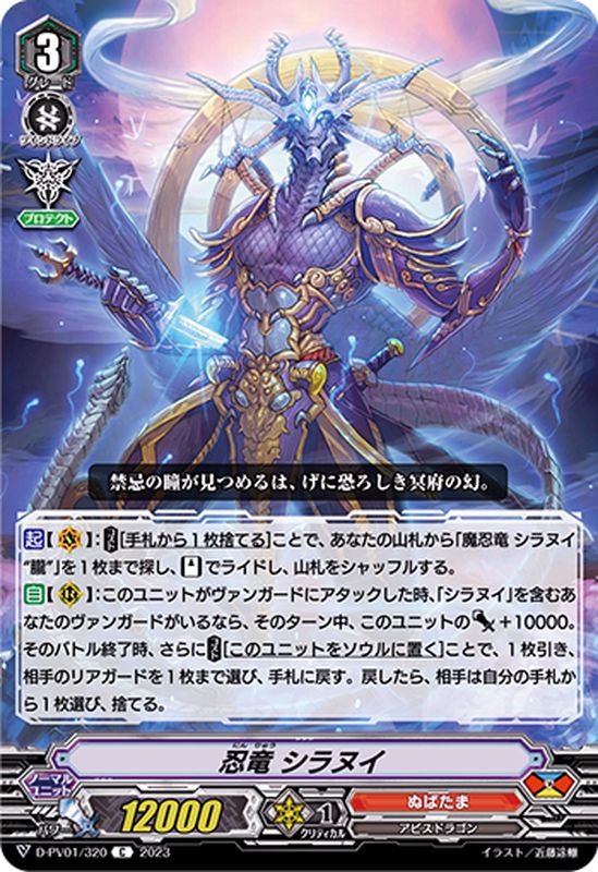 【起】【(V)】:【コスト】[手札から1枚捨てる]ことで、あなたの山札から「魔忍竜 シラヌイ “朧”」を1枚まで探し、【スタンド】でライドし、山札をシャッフルする。【自】【(R)】:このユニットがヴァンガードにアタックした時、「シラヌイ」を含むあなたのヴァンガードがいるなら、そのターン中、このユニットのパワー+10000。そのバトル終了時、さらに【コスト】[このユニットをソウルに置く]ことで、1枚引き、相手のリアガードを1枚まで選び、手札に戻す。戻したら、相手は自分の手札から1枚選び、捨てる。