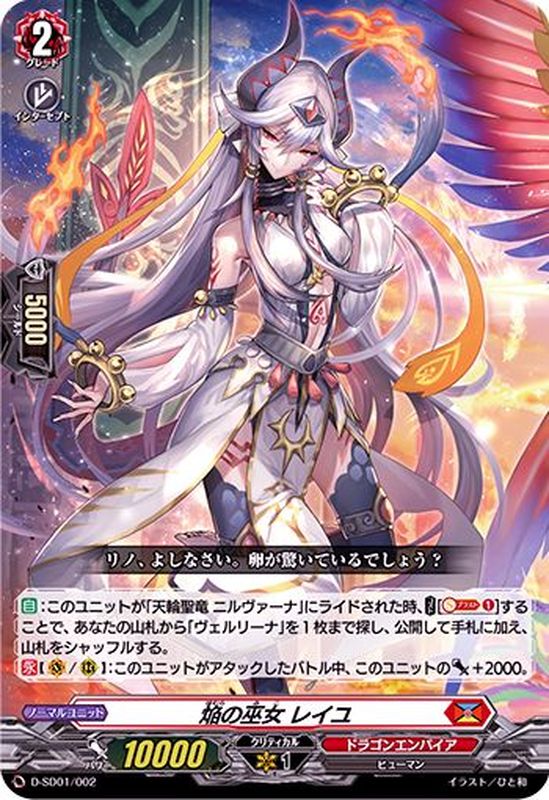 【自】:このユニットが「天輪聖竜 ニルヴァーナ」にライドされた時、【コスト】[【ソウルブラスト】(1)]することで、あなたの山札から「ヴェルリーナ」を1枚まで探し、公開して手札に加え、山札をシャッフルする。【永】【(V)/(R)】:このユニットがアタックしたバトル中、このユニットのパワー+2000。