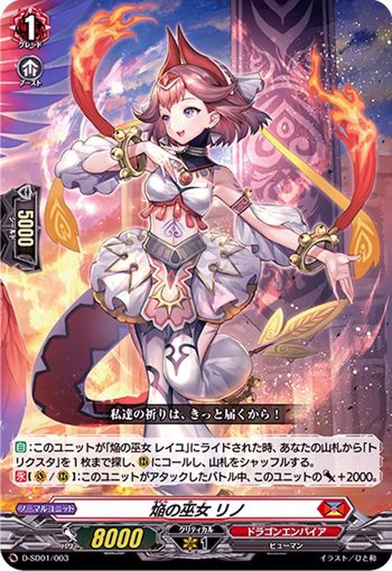 【自】:このユニットが「焔の巫女 レイユ」にライドされた時、あなたの山札から「トリクスタ」を1枚まで探し、(R)にコールし、山札をシャッフルする。【永】【(V)/(R)】:このユニットがアタックしたバトル中、このユニットのパワー+2000。