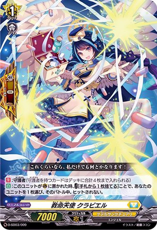 【永】:守護者(守護者を持つカードはデッキに合計4枚まで入れられる)【自】:このユニットが(G)に置かれた時、【コスト】[手札から1枚捨てる]ことで、あなたのユニットを1枚選び、そのバトル中、ヒットされない。