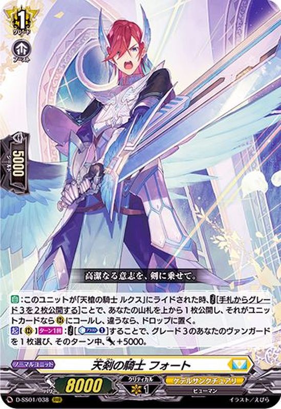 【自】:このユニットが「天槍の騎士 ルクス」にライドされた時、【コスト】[手札からグレード3を2枚公開する]ことで、あなたの山札を上から1枚公開し、それがユニットカードなら(R)にコールし、違うなら、ドロップに置く。【起】【(R)】【ターン1回】:【コスト】[【カウンターブラスト】(1)]することで、グレード3のあなたのヴァンガードを1枚選び、そのターン中、パワー+5000。