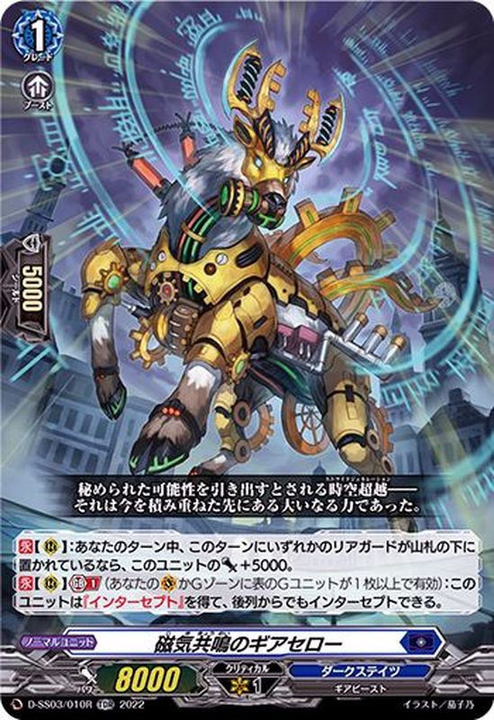【永】【(R)】:あなたのターン中、このターンにいずれかのリアガードが山札の下に置かれているなら、このユニットのパワー+5000。【永】【(R)】【Gブレイク】(1)(あなたの(V)かGゾーンに表のGユニットが1枚以上で有効):このユニットは『インターセプト』を得て、後列からでもインターセプトできる。