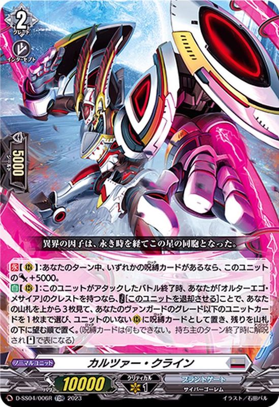 【永】【(R)】:あなたのターン中、いずれかの呪縛カードがあるなら、このユニットのパワー+5000。【自】【(R)】:このユニットがアタックしたバトル終了時、あなたが「オルターエゴ・メサイア」のクレストを持つなら、【コスト】[このユニットを退却させる]ことで、あなたの山札を上から3枚見て、あなたのヴァンガードのグレード以下のユニットカードを1枚まで選び、ユニットのいない(R)に呪縛カードとして置き、残りを山札の下に望む順で置く。(呪縛カードは何もできない。持ち主のターン終了時に解呪され【スタンド】で表になる)