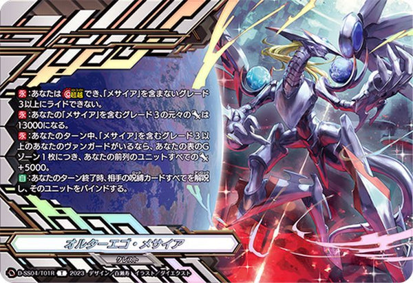 【永】:あなたは【超越】でき、「メサイア」を含まないグレード3以上にライドできない。【永】:あなたの「メサイア」を含むグレード3の元々のパワーは13000になる。【永】:あなたのターン中、「メサイア」を含むグレード3以上のあなたのヴァンガードがいるなら、あなたの表のGゾーン1枚につき、あなたの前列のユニットすべてのパワー+5000。【自】:あなたのターン終了時、相手の呪縛カードすべてを解呪し、そのユニットをバインドする。