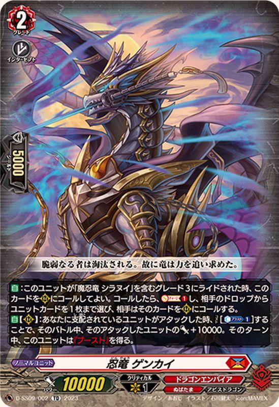 【自】:このユニットが「魔忍竜 シラヌイ」を含むグレード3にライドされた時、このカードを(R)にコールしてよい。コールしたら、【ソウルチャージ】(1)し、相手のドロップからユニットカードを1枚まで選び、相手はそのカードを(R)にコールする。【自】【(R)】:あなたに支配されているユニットがアタックした時、【コスト】[【カウンターブラスト】(1)]することで、そのバトル中、そのアタックしたユニットのパワー+10000。そのターン中、このユニットは『ブースト』を得る。