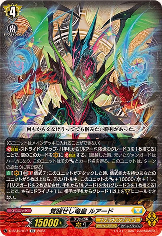 (Gユニットはメインデッキに入れることができない)【超越】-ストライドステップ-【コスト】[手札から「ルアード」を含むグレード3を1枚捨てる]ことで、裏のこのカードを(V)に【超越】する。(超越した時、元いたヴァンガードはハーツになり、このユニットはそのパワーとカード名を得る。このユニットは、ターンの終わりに表で戻る)【自】【(V)】【Gブレイク】(2)儀式7:このユニットがアタックした時、儀式能力を持つあなたのユニットが5枚以上なら、そのバトル中、このユニットのパワー+10000/クリティカル+1し、【コスト】[リアガードを2枚退却させ、手札から「ルアード」を含むグレード3を1枚捨てる]ことで、さらにドライブ+1し、相手は手札からグレード1以上を(G)にコールできない。