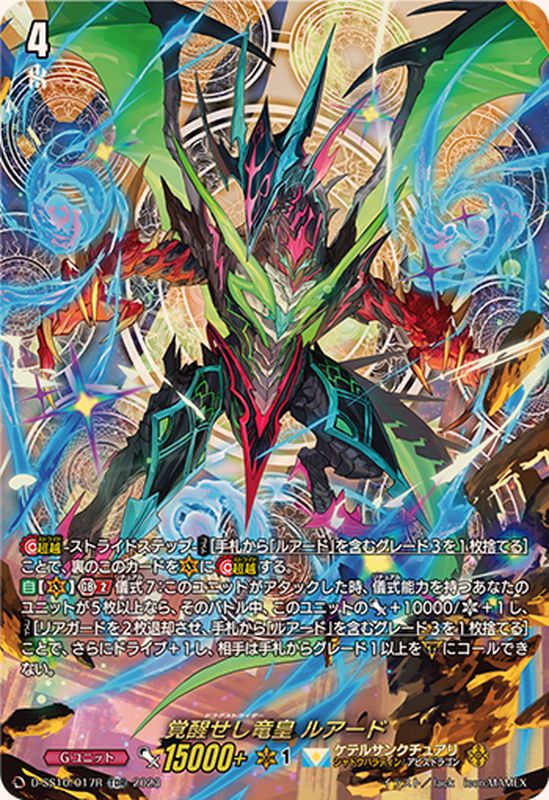 【超越】-ストライドステップ-【コスト】[手札から「ルアード」を含むグレード3を1枚捨てる]ことで、裏のこのカードを(V)に【超越】する。【自】【(V)】【Gブレイク】(2)儀式7:このユニットがアタックした時、儀式能力を持つあなたのユニットが5枚以上なら、そのバトル中、このユニットのパワー+10000/クリティカル+1し、【コスト】[リアガードを2枚退却させ、手札から「ルアード」を含むグレード3を1枚捨てる]ことで、さらにドライブ+1し、相手は手札からグレード1以上を(G)にコールできない。