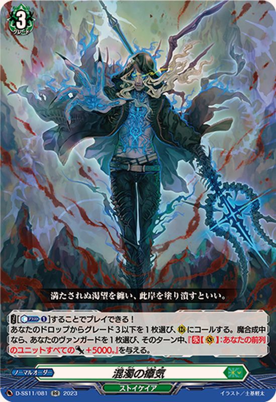 【コスト】[【カウンターブラスト】(1)]することでプレイできる!あなたのドロップからグレード3以下を1枚選び、(R)にコールする。魔合成中なら、あなたのヴァンガードを1枚選び、そのターン中、『【永】【(V)】:あなたの前列のユニットすべてのパワー+5000。』を与える。