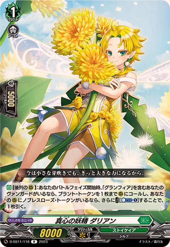 【自】【後列の(R)】:あなたのバトルフェイズ開始時、「グランフィア」を含むあなたのヴァンガードがいるなら、プラント・トークンを1枚まで(R)にコールし、あなたの(R)にノブレスローズ・トークンがいるなら、さらに【コスト】[【カウンターブラスト】(1)]することで、1枚引く。