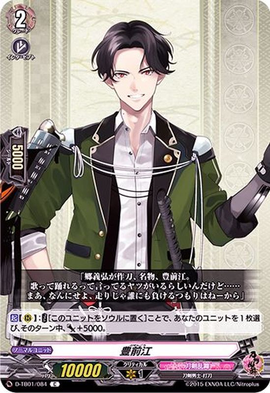 フレバーテキスト:「郷義弘が作刀、名物、 豊前江。歌って踊れるって言ってるヤツがいるらしいんだけど……まあ、なんにせよ、走りじゃ誰にも負けるつもりはねーから」