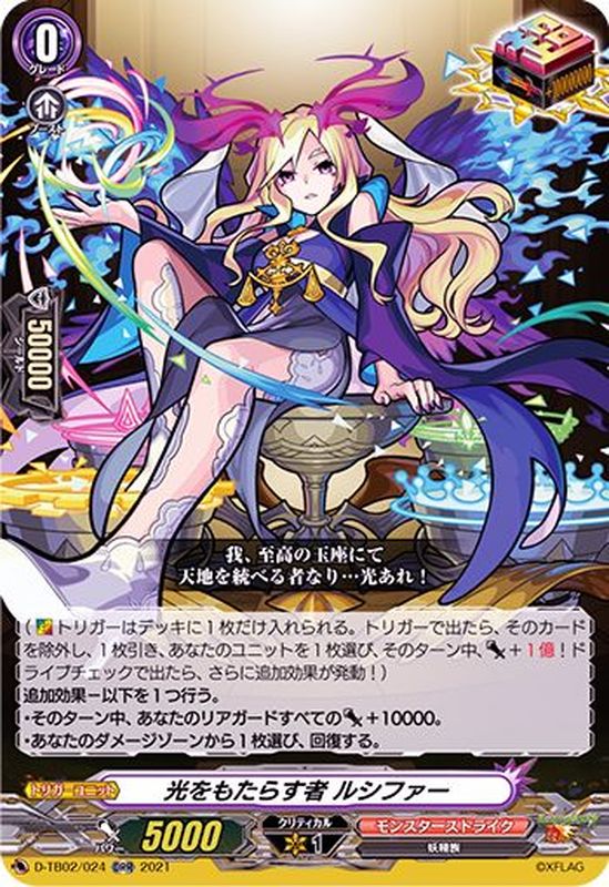 (【超】トリガーはデッキに1枚だけ入れられる。トリガーで出たら、そのカードを除外し、1枚引き、あなたのユニットを1枚選び、そのターン中、パワー+1億!ドライブチェックで出たら、さらに追加効果が発動!)追加効果-以下を1つ行う。・そのターン中、あなたのリアガードすべてのパワー+10000。・あなたのダメージゾーンから1枚選び、回復する。
