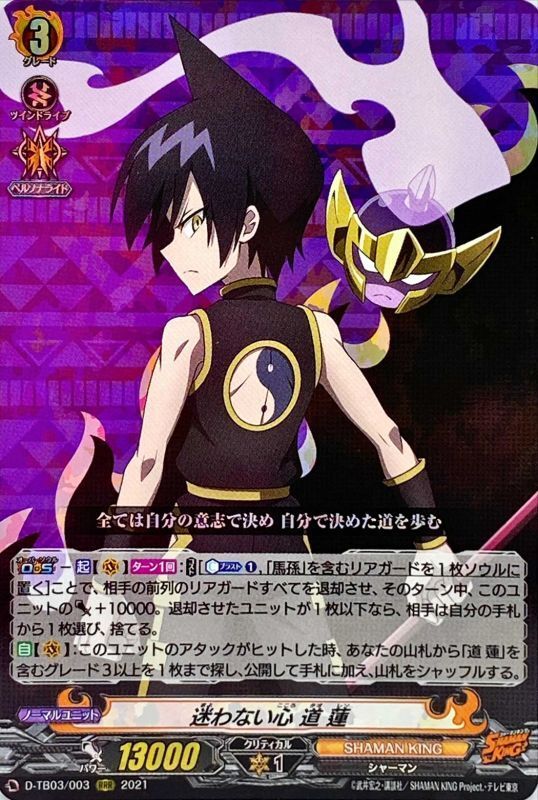 【オーバーソウル】-【起】【(V)】【ターン1回】:【コスト】[【カウンターブラスト】(1),「馬孫」を含むリアガードを1枚ソウルに置く]ことで、相手の前列のリアガードすべてを退却させ、そのターン中、このユニットのパワー+10000。退却させたユニットが1枚以下なら、相手は自分の手札から1枚選び、捨てる。【自】【(V)】:このユニットのアタックがヒットした時、あなたの山札から「道 蓮」を含むグレード3以上を1枚まで探し、公開して手札に加え、山札をシャッフルする。