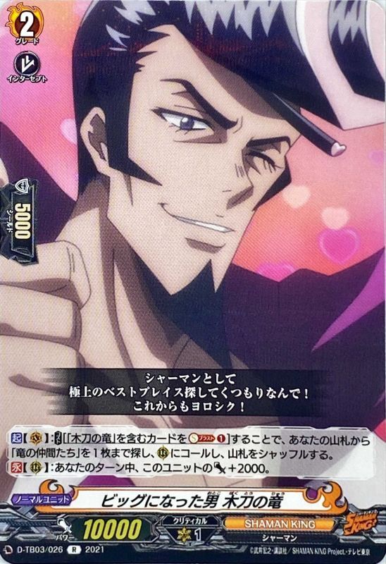 【起】【(V)】:【コスト】[「木刀の竜」を含むカードを【ソウルブラスト】(1)]することで、あなたの山札から「竜の仲間たち」を1枚まで探し、(R)にコールし、山札をシャッフルする。【永】【(R)】:あなたのターン中、このユニットのパワー+2000。