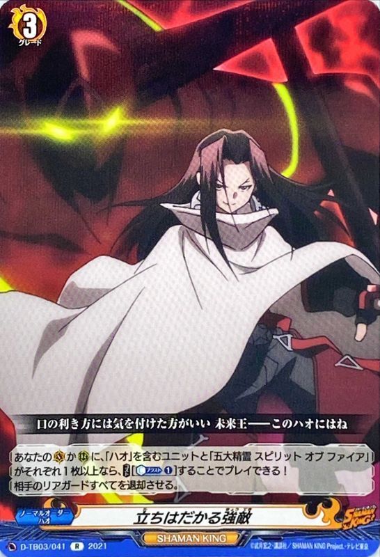 あなたの(V)か(R)に、「ハオ」を含むユニットと「五大精霊 スピリット オブ ファイア」がそれぞれ1枚以上なら、【コスト】[【カウンターブラスト】(1)]することでプレイできる!相手のリアガードすべてを退却させる。