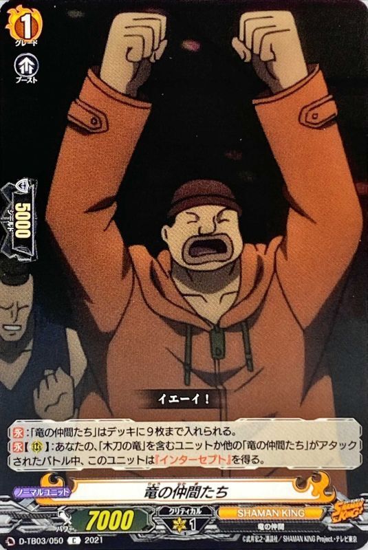 【永】:「竜の仲間たち」はデッキに9枚まで入れられる。【永】【(R)】:あなたの、「木刀の竜」を含むユニットか他の「竜の仲間たち」がアタックされたバトル中、このユニットは『インターセプト』を得る。