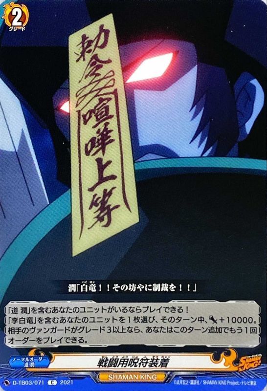 「道 潤」を含むあなたのユニットがいるならプレイできる!「李白竜」を含むあなたのユニットを1枚選び、そのターン中、パワー+10000。相手のヴァンガードがグレード3以上なら、あなたはこのターン追加でもう1回オーダーをプレイできる。