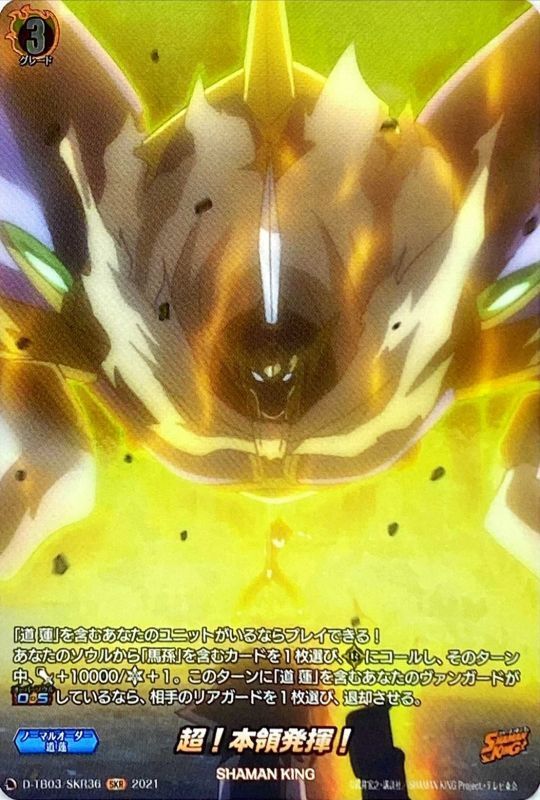 「道 蓮」を含むあなたのユニットがいるならプレイできる!あなたのソウルから「馬孫」を含むカードを1枚選び、(R)にコールし、そのターン中、パワー+10000/クリティカル+1。このターンに「道 蓮」を含むあなたのヴァンガードが【オーバーソウル】しているなら、相手のリアガードを1枚選び、退却させる。