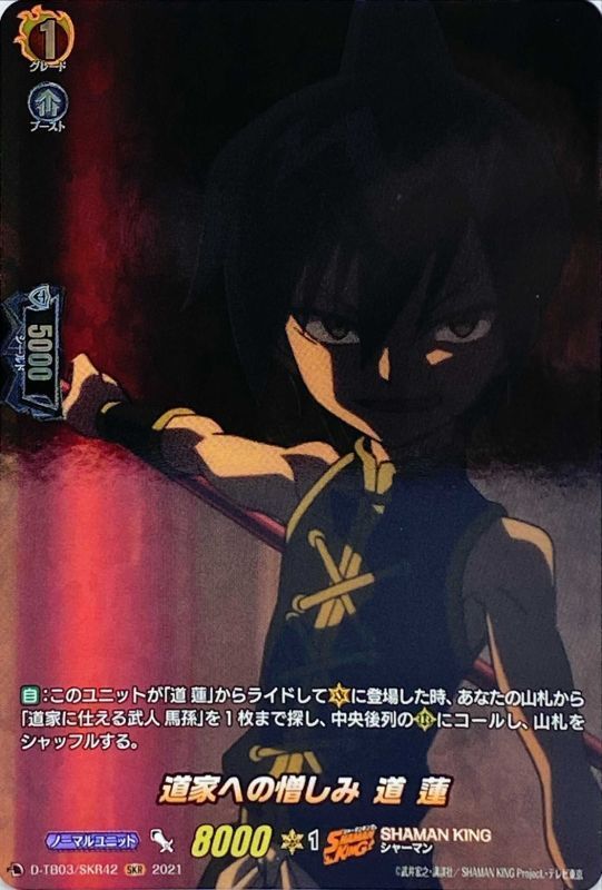 【自】:このユニットが「道 蓮」からライドして(V)に登場した時、あなたの山札から「道家に仕える武人 馬孫」を1枚まで探し、中央後列の(R)にコールし、山札をシャッフルする。