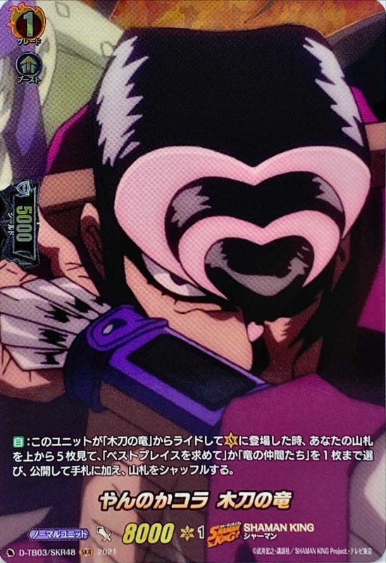 【自】:このユニットが「木刀の竜」からライドして(V)に登場した時、あなたの山札を上から5枚見て、「ベストプレイスを求めて」か「竜の仲間たち」を1枚まで選び、公開して手札に加え、山札をシャッフルする。