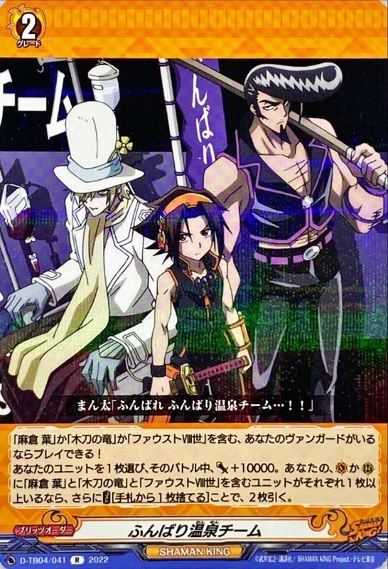 「麻倉 葉」か「木刀の竜」か「ファウストⅧ世」を含む、あなたのヴァンガードがいるならプレイできる!あなたのユニットを1枚選び、そのバトル中、パワー+10000。あなたの、(V)か(R)に「麻倉 葉」と「木刀の竜」と「ファウストⅧ世」を含むユニットがそれぞれ1枚以上いるなら、さらに【コスト】[手札から1枚捨てる]ことで、2枚引く。