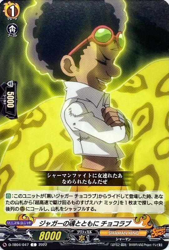 【自】:このユニットが「黒いジャガー チョコラブ」からライドして登場した時、あなたの山札から「超高速で駆け回るものすげえハナ ミック」を1枚まで探し、中央後列の(R)にコールし、山札をシャッフルする。