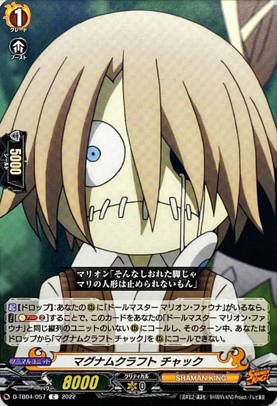 【起】【ドロップ】:あなたの(R)に「ドールマスター マリオン・ファウナ」がいるなら、【コスト】[【ソウルブラスト】(2)]することで、このカードをあなたの「ドールマスター マリオン・ファウナ」と同じ縦列のユニットのいない(R)にコールし、そのターン中、あなたはドロップから「マグナムクラフト チャック」を(R)にコールできない。