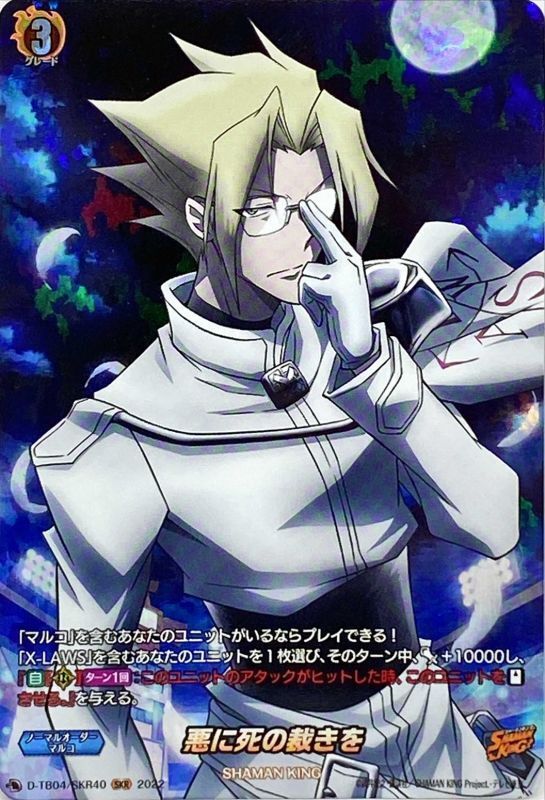 「マルコ」を含むあなたのユニットがいるならプレイできる!「X-LAWS」を含むあなたのユニットを1枚選び、そのターン中、パワー+10000し、『【自】【(R)】【ターン1回】:このユニットのアタックがヒットした時、このユニットを【スタンド】させる。』を与える。