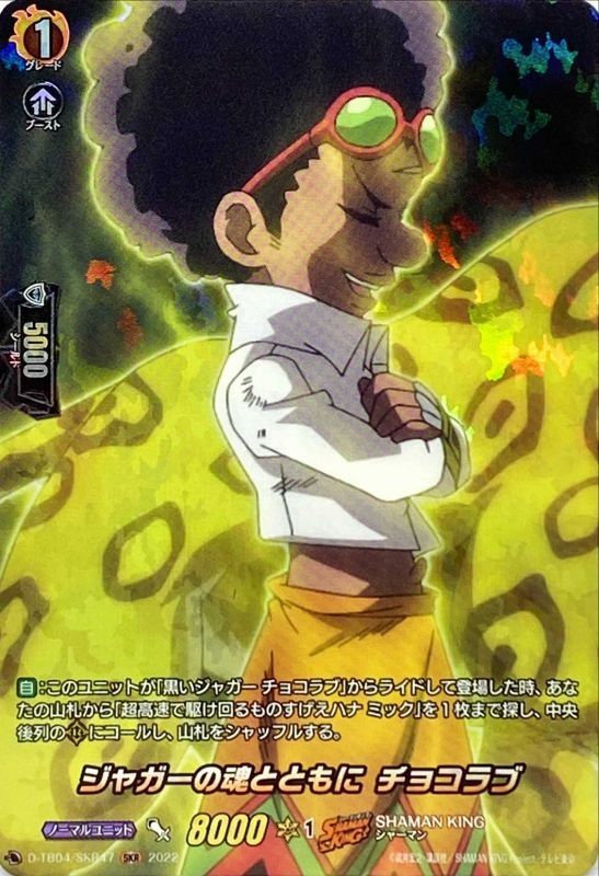 【自】:このユニットが「黒いジャガー チョコラブ」からライドして登場した時、あなたの山札から「超高速で駆け回るものすげえハナ ミック」を1枚まで探し、中央後列の(R)にコールし、山札をシャッフルする。