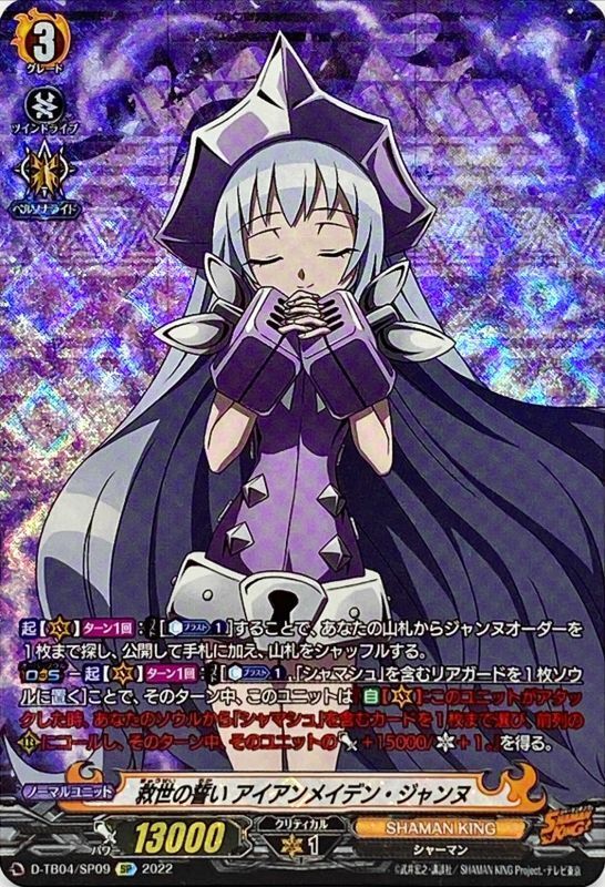 【起】【(V)】【ターン1回】:【コスト】[【カウンターブラスト】(1)]することで、あなたの山札からジャンヌオーダーを1枚まで探し、公開して手札に加え、山札をシャッフルする。【オーバーソウル】-【起】【(V)】【ターン1回】:【コスト】[【カウンターブラスト】(1),「シャマシュ」を含むリアガードを1枚ソウルに置く]ことで、そのターン中、このユニットは『【自】【(V)】:このユニットがアタックした時、あなたのソウルから「シャマシュ」を含むカードを1枚まで選び、前列の(R)にコールし、そのターン中、そのユニットのパワー+15000/クリティカル+1。』を得る。