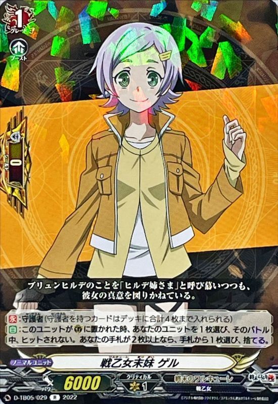 【永】:守護者(守護者を持つカードはデッキに合計4枚まで入れられる)【自】:このユニットが(G)に置かれた時、あなたのユニットを1枚選び、そのバトル中、ヒットされない。あなたの手札が2枚以上なら、手札から1枚選び、捨てる。