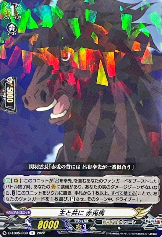 【自】【(R)】:このユニットが「呂布奉先」を含むあなたのヴァンガードをブーストしたバトル終了時、あなたの(V)に装備があり、あなたの表のダメージゾーンがないなら、【コスト】[このユニットをソウルに置き,手札から1枚以上、すべて捨てる]ことで、あなたのヴァンガードを1枚選び、【スタンド】させ、そのターン中、ドライブ-1。