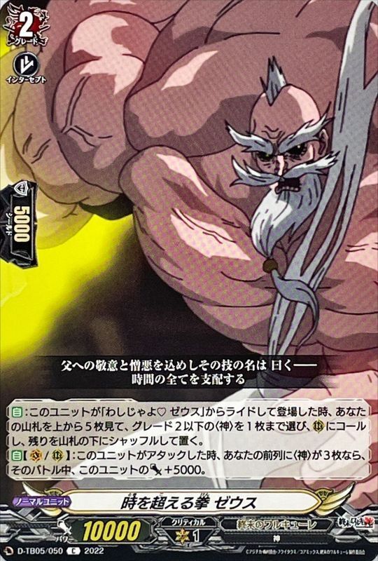 【自】:このユニットが「わしじゃよ♡ ゼウス」からライドして登場した時、あなたの山札を上から5枚見て、グレード2以下の〈神〉を1枚まで選び、(R)にコールし、残りを山札の下にシャッフルして置く。【自】【(V)/(R)】:このユニットがアタックした時、あなたの前列に〈神〉が3枚なら、そのバトル中、このユニットのパワー+5000。