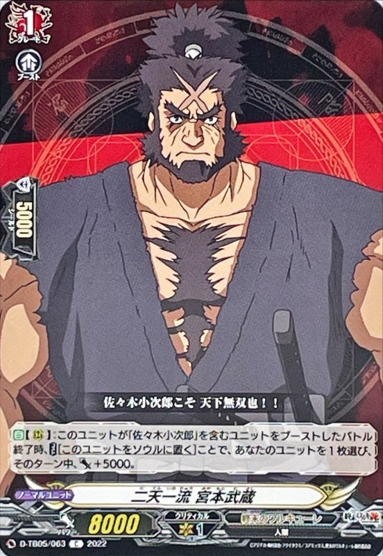 【自】【(R)】:このユニットが「佐々木小次郎」を含むユニットをブーストしたバトル終了時、【コスト】[このユニットをソウルに置く]ことで、あなたのユニットを1枚選び、そのターン中、パワー+5000。