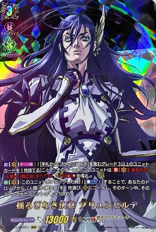 【起】【(V)】【ターン1回】:【コスト】[手札から「ブリュンヒルデ」を含むグレード3以上のユニットカードを1枚捨てる]ことで、そのターン中、このユニットは『【永】【(V)】:あなたの、〈人類〉と〈戦乙女〉すべてのパワー+5000。』を得る。【自】【(V)】:このユニットがアタックした時、【コスト】[【カウンターブラスト】(1)]することで、あなたのドロップから、〈人類〉か〈戦乙女〉を1枚選び、(R)にコールし、そのターン中、そのコールされたユニットのパワー+5000。