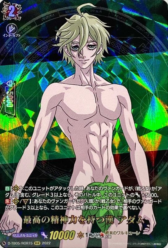 【自】【(R)】:このユニットがアタックした時、あなたのヴァンガードが、〈戦乙女〉か「アダム」を含む、グレード3以上なら、そのバトル中、このユニットのパワー+5000。【永】【(R)/(G)】:あなたのヴァンガードが、〈人類〉か〈戦乙女〉で、相手のヴァンガードがグレード3以上なら、このユニットは相手のカードの効果で選べない。
