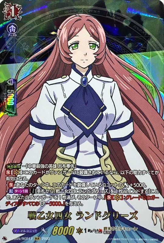 【神器錬成】-「中華最強の英雄 呂布奉先」(装備オーダーとしてプレイし、(V)にいる指定ユニットに装備できる。装備になったこのカードはユニットではなくなり、新たに【神器錬成】を装備したら、このカードをドロップに置く)【永】【(V)】:このカードがヴァンガードに装備されているなら、以下の能力すべてが有効になる。・【永】:あなたのターン中、このカードを装備しているユニットのパワー+5000。・【起】【ターン1回】:【コスト】[手札から「戦乙女四女 ランドグリーズ」を1枚バインドする]ことで、あなたのヴァンガードを1枚選び、そのターン中、『【永】【(V)】:グレード0のガーディアンすべてのシールド-5000。』を与える。