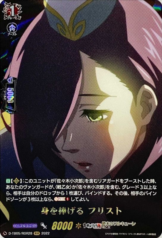 【自】【(R)】:このユニットが「佐々木小次郎」を含むリアガードをブーストした時、あなたのヴァンガードが、〈戦乙女〉か「佐々木小次郎」を含む、グレード3以上なら、相手は自分のドロップから1枚選び、バインドする。その後、相手のバインドゾーンが3枚以上なら、【ソウルチャージ】(1)してよい。
