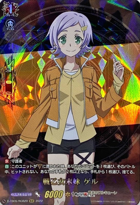【永】:守護者【自】:このユニットが(G)に置かれた時、あなたのユニットを1枚選び、そのバトル中、ヒットされない。あなたの手札が2枚以上なら、手札から1枚選び、捨てる。