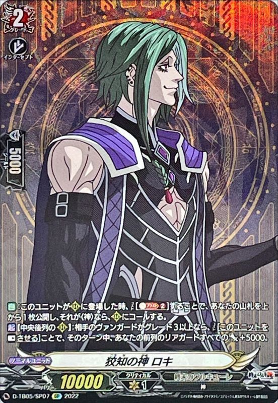 【自】:このユニットが(R)に登場した時、【コスト】[【ソウルブラスト】(2)]することで、あなたの山札を上から1枚公開し、それが〈神〉なら、(R)にコールする。【起】【中央後列の(R)】:相手のヴァンガードがグレード3以上なら、【コスト】[このユニットを【レスト】させる]ことで、そのターン中、あなたの前列のリアガードすべてのパワー+5000。