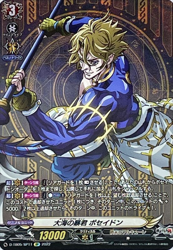 【起】【(V)】【ターン1回】:【コスト】[リアガードを1枚【レスト】させる]ことで、あなたの山札からポセイドンオーダーを1枚まで探し、公開して手札に加え、山札をシャッフルする。【起】【(V)】【ターン1回】:【コスト】[【カウンターブラスト】(1),リアガードを1枚以上、望む枚数退却させる]ことで、このコストで退却させたユニット1枚につき、そのターン中、このユニットのパワー+5000。2枚以上退却させたら、そのターン中、このユニットのドライブ+1。