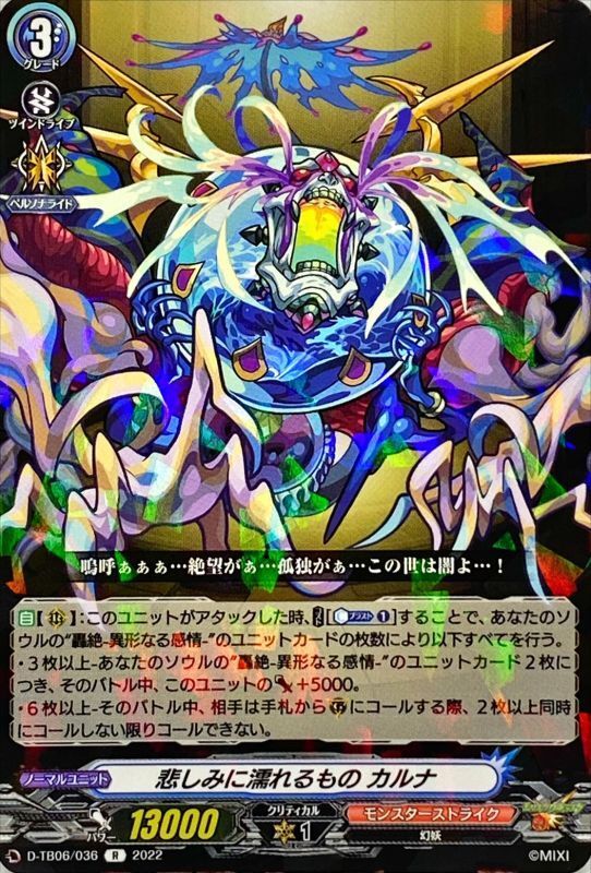 【自】【(R)】:このユニットがアタックした時、【コスト】[【カウンターブラスト】(1)]することで、あなたのソウルの“轟絶-異形なる感情-”のユニットカードの枚数により以下すべてを行う。・3枚以上-あなたのソウルの“轟絶-異形なる感情-”のユニットカード2枚につき、そのバトル中、このユニットのパワー+5000。・6枚以上-そのバトル中、相手は手札から(G)にコールする際、2枚以上同時にコールしない限りコールできない。