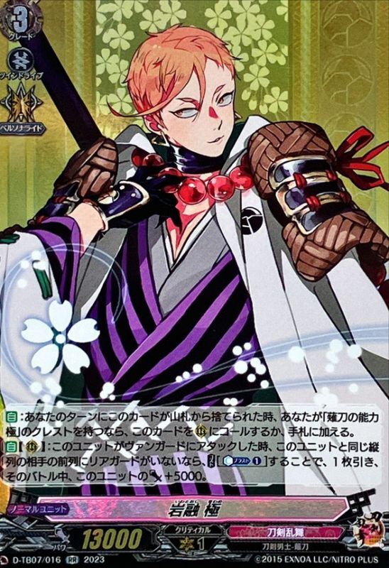 【自】:あなたのターンにこのカードが山札から捨てられた時、あなたが「薙刀の能力 極」のクレストを持つなら、このカードを(R)にコールするか、手札に加える。 【自】【(R)】:このユニットがヴァンガードにアタックした時、このユニットと同じ縦列の相手の前列にリアガードがいないなら、【コスト】[【カウンターブラスト】(1)]することで、1枚引き、そのバトル中、このユニットのパワー+5000。