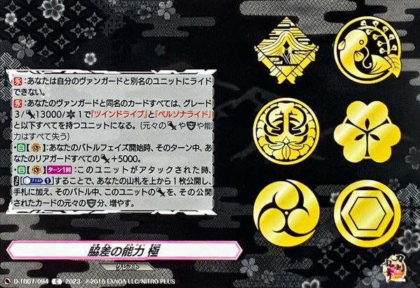 【永】:あなたは自分のヴァンガードと別名のユニットにライドできない。【永】:あなたのヴァンガードと同名のカードすべては、グレード3/パワー13000/クリティカル1で『ツインドライブ』と『ペルソナライド』と以下すべてを持つユニットになる。(元々のパワーやシールドや能力はすべて失う)・【自】【(V)】:あなたのバトルフェイズ開始時、そのターン中、あなたのリアガードすべてのパワー+5000。・【自】【(V)】【ターン1回】:このユニットがアタックされた時、【コスト】[【カウンターブラスト】(1)]することで、あなたの山札を上から1枚公開し、手札に加え、そのバトル中、このユニットのパワーを、その公開されたカードの元々のシールド分、増やす。