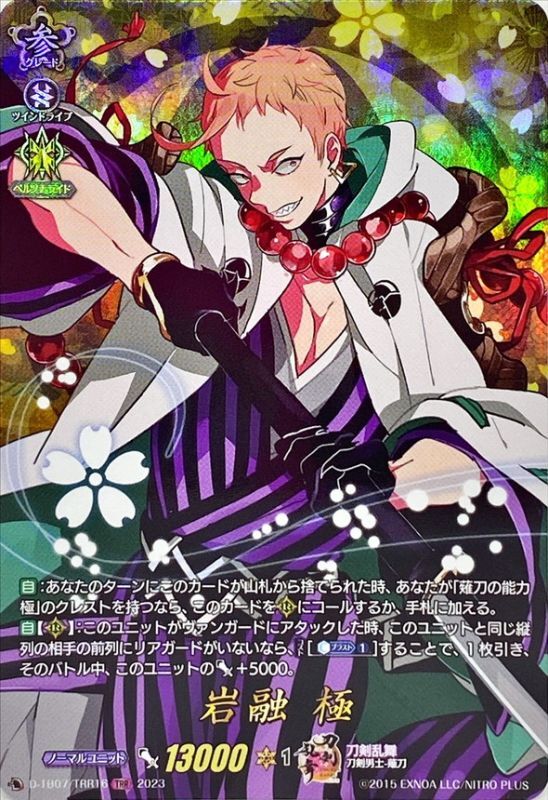 【自】:あなたのターンにこのカードが山札から捨てられた時、あなたが「薙刀の能力 極」のクレストを持つなら、このカードを(R)にコールするか、手札に加える。 【自】【(R)】:このユニットがヴァンガードにアタックした時、このユニットと同じ縦列の相手の前列にリアガードがいないなら、【コスト】[【カウンターブラスト】(1)]することで、1枚引き、そのバトル中、このユニットのパワー+5000。