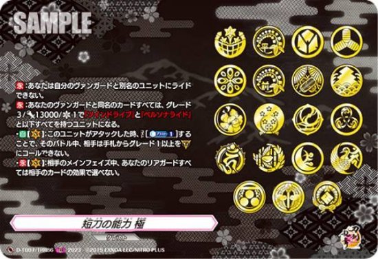 【永】:あなたは自分のヴァンガードと別名のユニットにライドできない。【永】:あなたのヴァンガードと同名のカードすべては、グレード3/パワー13000/クリティカル1で『ツインドライブ』と『ペルソナライド』と以下すべてを持つユニットになる。・【自】【(V)】:このユニットがアタックした時、【コスト】[【カウンターブラスト】(1)]することで、そのバトル中、相手は手札からグレード1以上を(G)にコールできない。・【永】【(V)】:相手のメインフェイズ中、あなたのリアガードすべては相手のカードの効果で選べない。