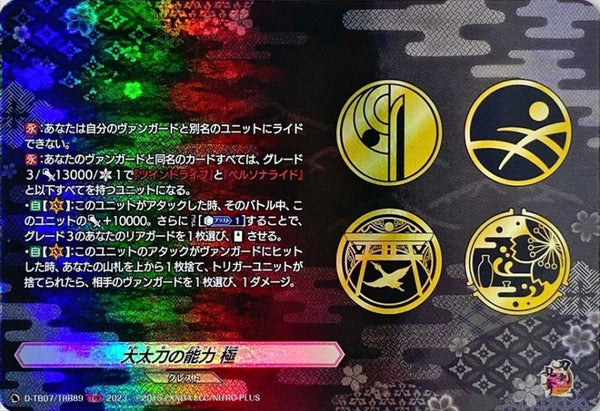 【永】:あなたは自分のヴァンガードと別名のユニットにライドできない。【永】:あなたのヴァンガードと同名のカードすべては、グレード3/パワー13000/クリティカル1で『ツインドライブ』と『ペルソナライド』と以下すべてを持つユニットになる。・【自】【(V)】:このユニットがアタックした時、そのバトル中、このユニットのパワー+10000。さらに【コスト】[【カウンターブラスト】(1)]することで、グレード3のあなたのリアガードを1枚選び、【スタンド】させる。・【自】【(V)】:このユニットのアタックがヴァンガードにヒットした時、あなたの山札を上から1枚捨て、トリガーユニットが捨てられたら、相手のヴァンガードを1枚選び、1ダメージ。