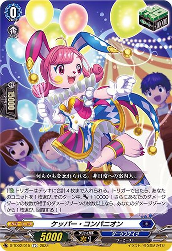 (【治】トリガーはデッキに合計4枚まで入れられる。トリガーで出たら、あなたのユニットを1枚選び、そのターン中、パワー+10000!さらにあなたのダメージゾーンの枚数が相手のダメージゾーンの枚数以上なら、あなたのダメージゾーンから1枚選び、回復する!)