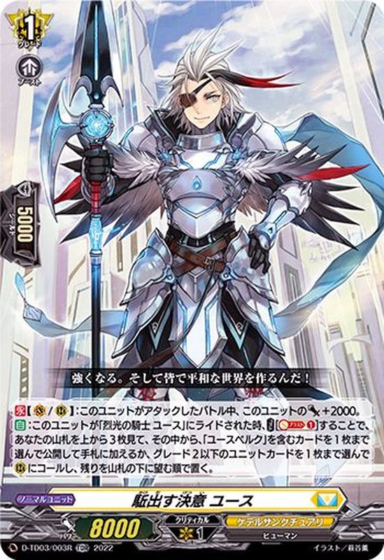 【永】【(V)/(R)】:このユニットがアタックしたバトル中、このユニットのパワー+2000。【自】:このユニットが「烈光の騎士 ユース」にライドされた時、【コスト】[【ソウルブラスト】(1)]することで、あなたの山札を上から3枚見て、その中から、「ユースベルク」を含むカードを1枚まで選んで公開して手札に加えるか、グレード2以下のユニットカードを1枚まで選んで(R)にコールし、残りを山札の下に望む順で置く。