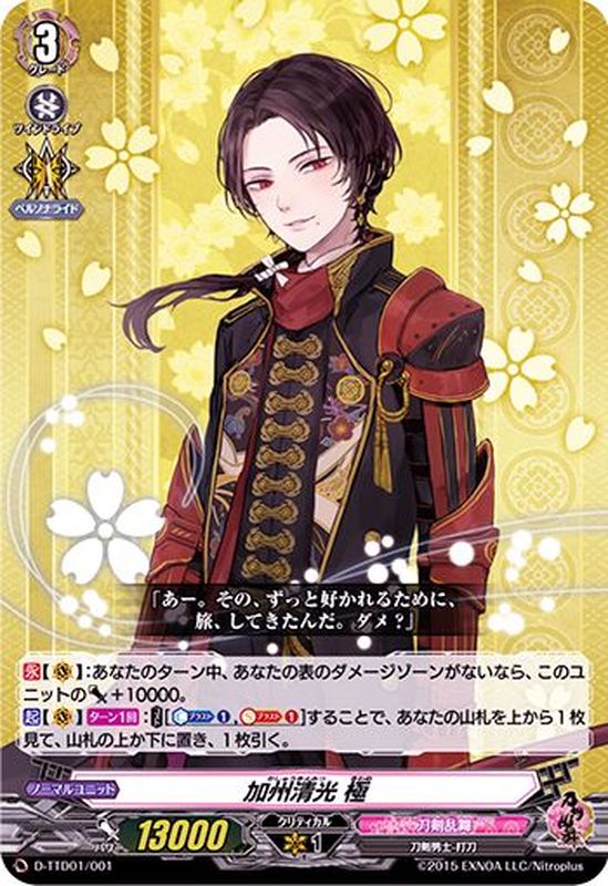 【永】【(V)】:あなたのターン中、あなたの表のダメージゾーンがないなら、このユニットのパワー+10000。【起】【(V)】【ターン1回】:【コスト】[【カウンターブラスト】(1),【ソウルブラスト】(1)]することで、あなたの山札を上から1枚見て、山札の上か下に置き、1枚引く。